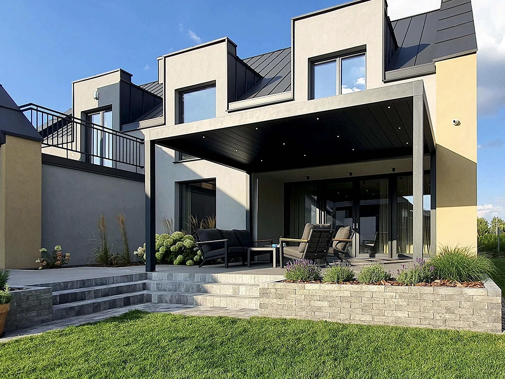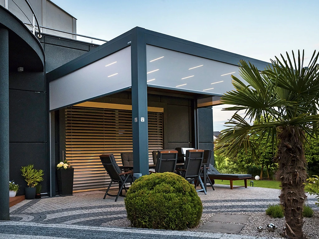 La pergola à toile rétractable s’adapte aussi bien aux maisons modernes qu’aux habitations plus traditionnelles.