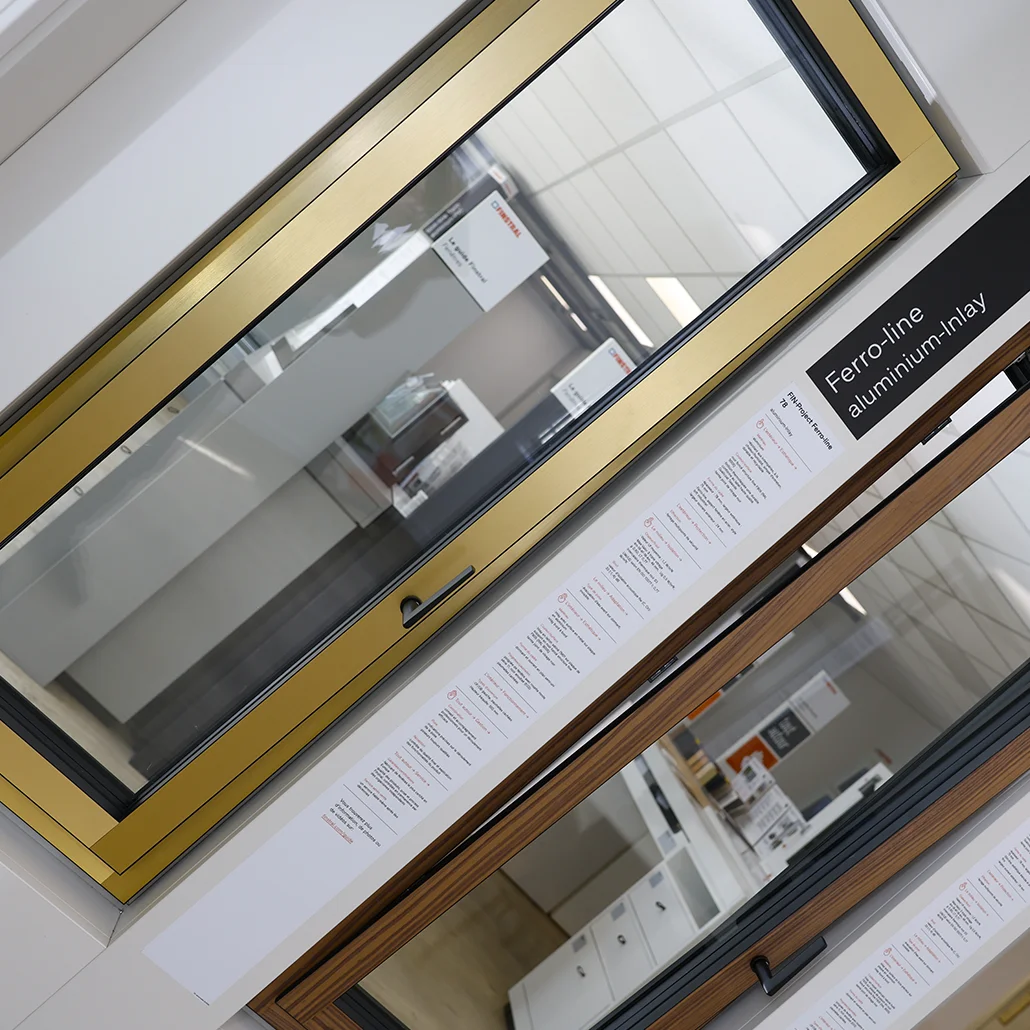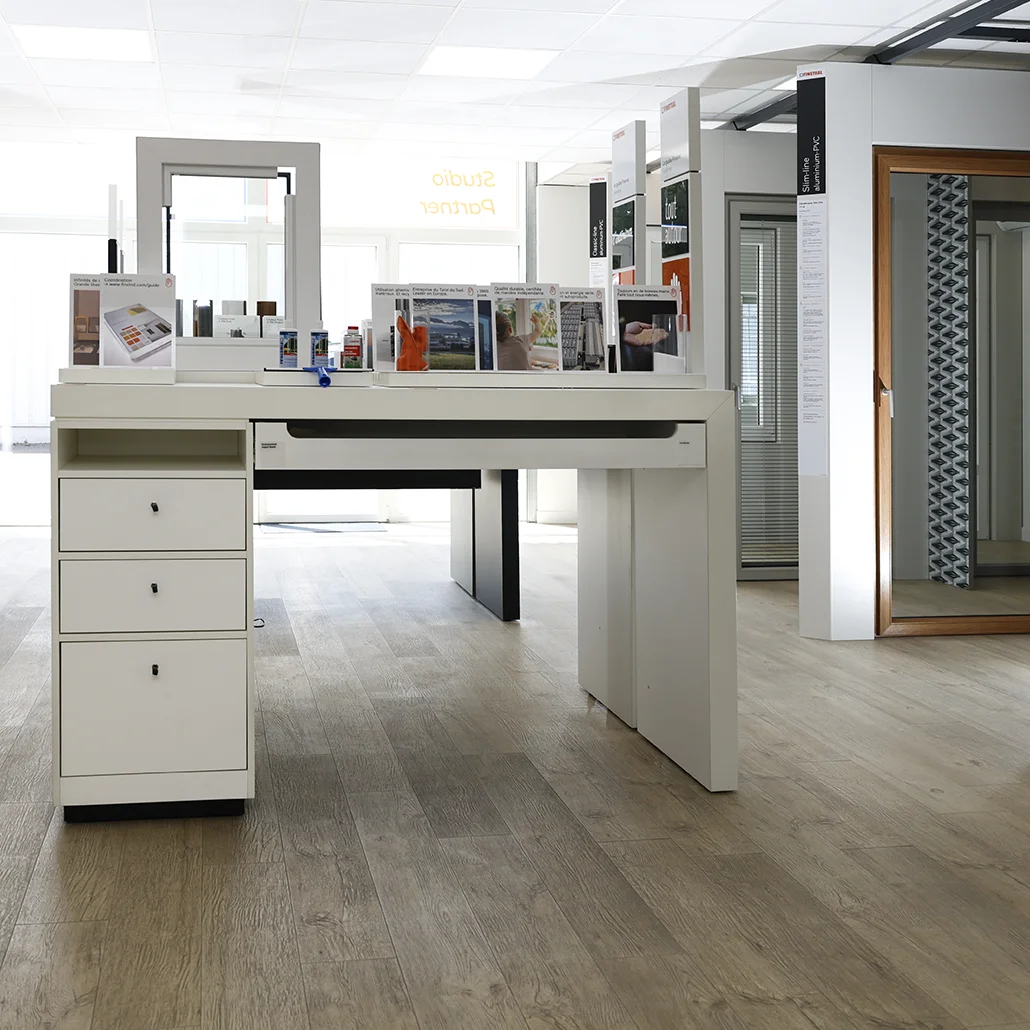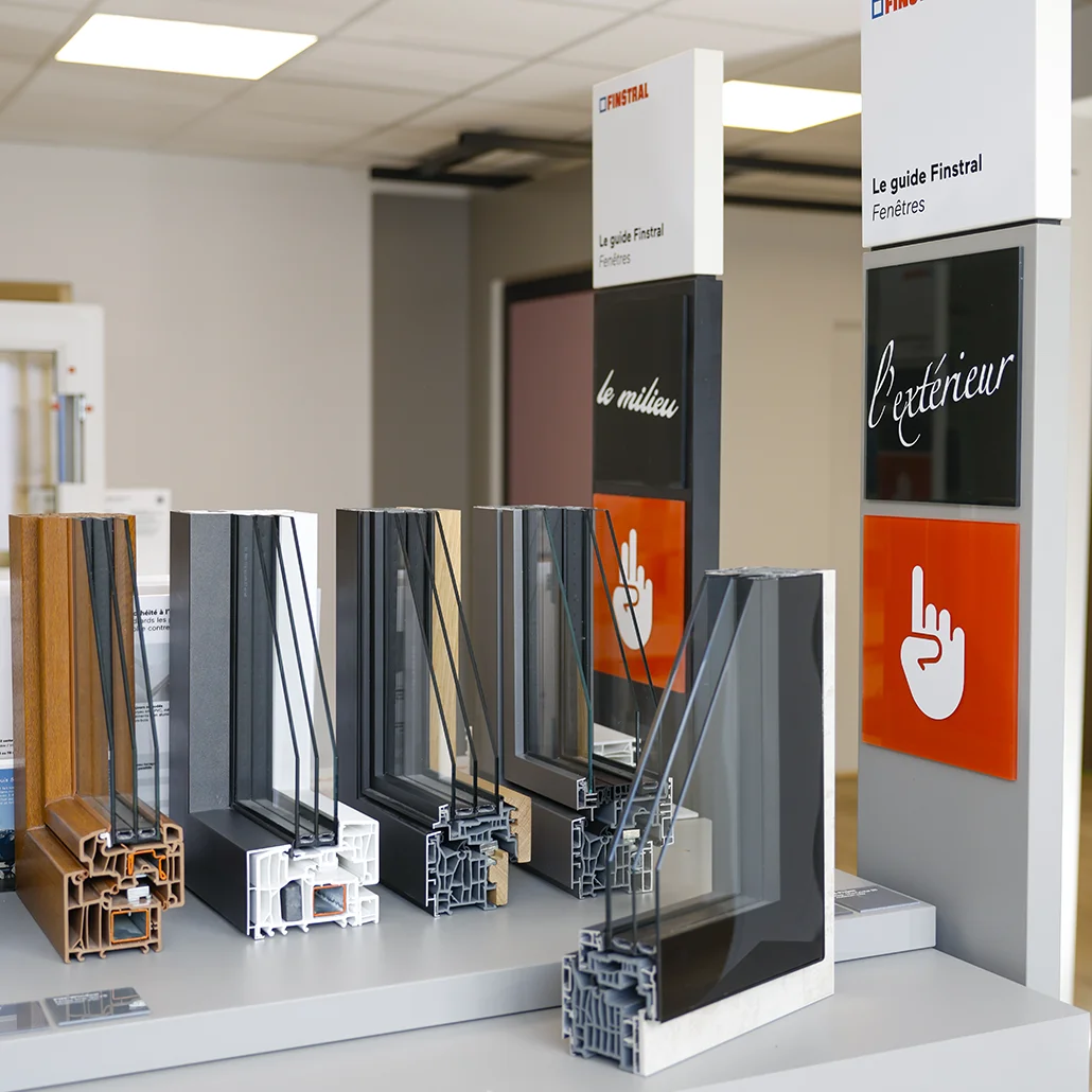 Grâce aux tables de démonstration, vous pouvez observer les profils en coupe, comparer les matériaux, les vitrages et les finitions afin de choisir les menuiseries les plus adaptées à votre logement.